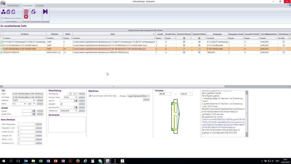 To manage that, Bosch invested in several RADAN modules – Radimport, Radprofile, Radmanager and Radquote, which automates most of the calculations. The engineering department produces 3D SolidWorks models which are imported into Radprofile through Radimport, and automatically unfolded, showing laser cutting time and material usage.