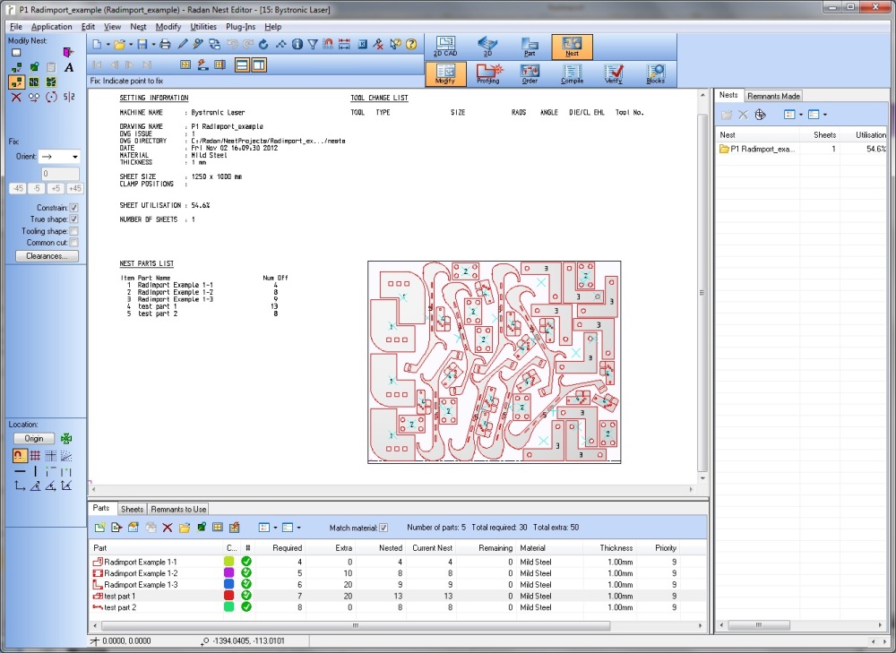 Dave Caughley Product Manager for RADAN’s new Logistics Group, says for many sheet metal fabricators the work to prepare parts for nesting is extremely time consuming. Also, once Radimport has created the RADAN parts, the geometry files can be converted to a nest project. “The user has the option to edit the quantities and other properties of the parts before creating the Nest Project. Radimport can automatically launch the RADAN Nester to start nesting straight away.”